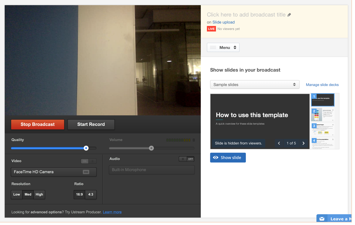You may also manage your slides from the Web Broadcaster by selecting the Go LIVE button in the top right corner of your Dashboard. Once the Web broadcaster is open, select the Menu button and choose Slides.